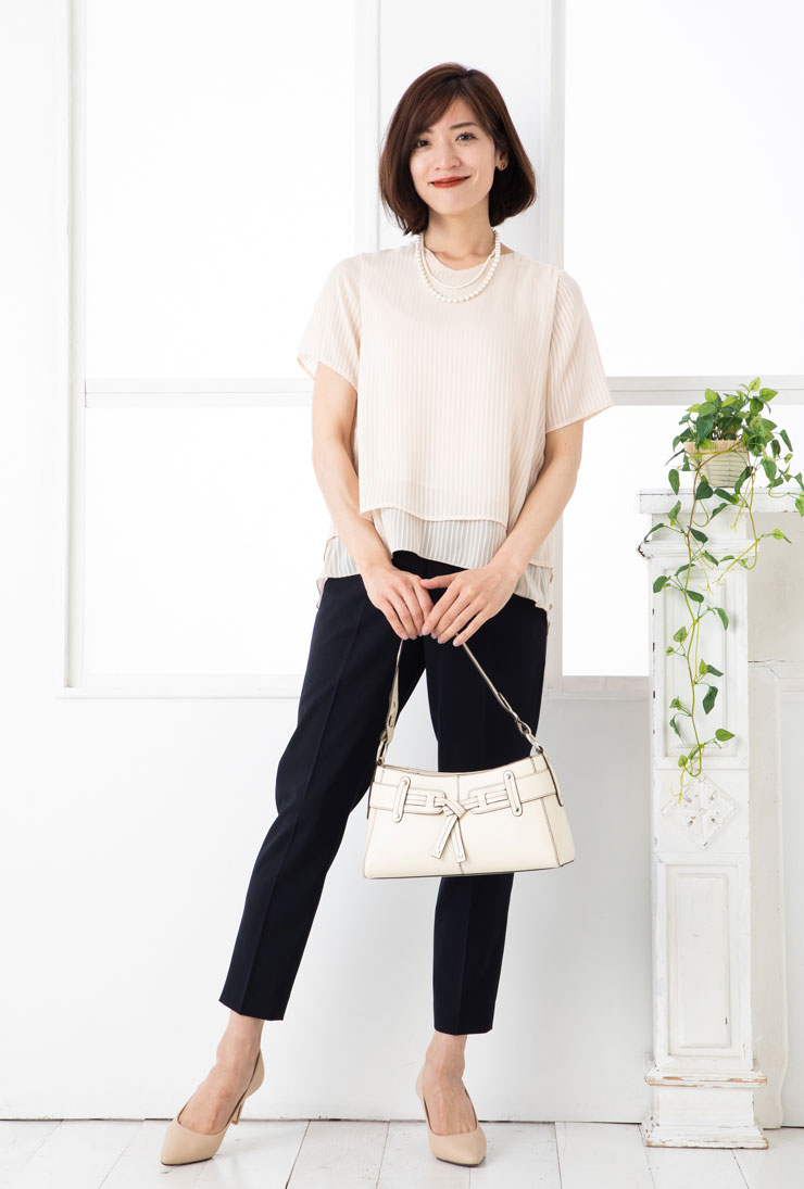 ▼ ベージュストライプB コーディネートアイテムはこちら ▼ ベージュストライプB コーディネートアイテムはこちら ▼ オフストライプB コーディネートアイテムはこちら ▼ オフストライプB コーディネートアイテムはこちら ▼ ノーブルブラック無地 コーディネートアイテムはこちら ▼ ノーブルブラック無地 コーディネートアイテムはこちら ▼ モーブピンク無地 コーディネートアイテムはこちら ▼ オフホワイ卜無地 コーディネートアイテムはこちら ▼ オフホワイ卜無地 コーディネートアイテムはこちら ▼ ネイビーストライプB コーディネートアイテムはこちら ▼ オフストライプA コーディネートアイテムはこちら ▼ オフストライプA コーディネートアイテムはこちら ▼ オフホワイト(旧カラー) コーディネートアイテムはこちら ▼ オフホワイト(旧カラー) コーディネートアイテムはこちら ▼ ピーチピンク(旧カラー) コーディネートアイテムはこちら ※モデル身長167cm、着用サイズ:S 旧品番:05-02-46206 品番:07-04-46234/07-02-66256 ジョーゼット天竺Vネック裾レイヤードブラウス 半袖 七分袖 ※生産時期により、色み、また襟周りの開きが若干異なる場合がございます。