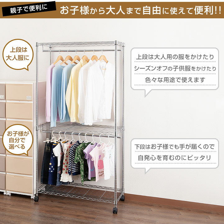 スチールラック業界トップシェアの「ルミナス」でおなじみのドウシシャ製だから、ルミナスの豊富なパーツでカスタム自由自在! 上下2段で使えるので、下段は子供用ハンガーラック、上段は大人用ハンガーラック等、色々な用途で使えます。