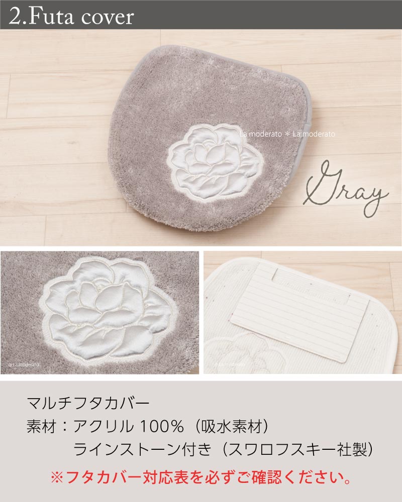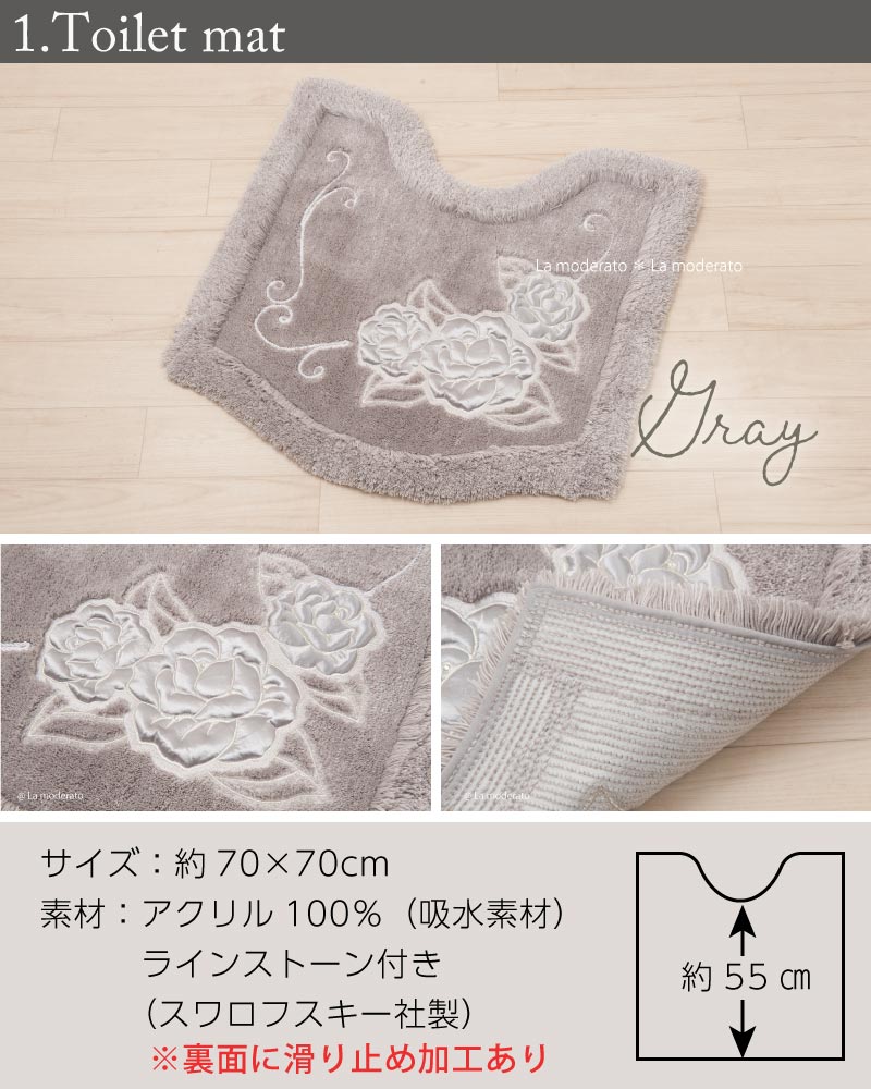 ⇒ 詳しくはこちら 素材 アクリル100% (吸水素材) ラインストーン付き(スワロフスキー社製) 裏面-すべりにくい加工あり カラー グレー 原産国 中国 ご注意 ■トイレマット: 注意 ・マットに飛び乗るとすべってけがをすることがありますので飛び乗らないでください。